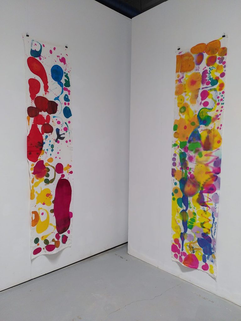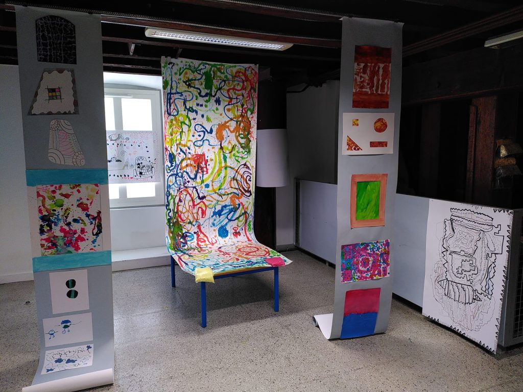 Les oeuvres des enfants réalisées dans le cadre des traversées « Explorations de la couleur » prennent toute leur ampleur. Ce parcours EAC arts visuels s’inscrit en résonance de la découverte du travail de Roland Orépük.