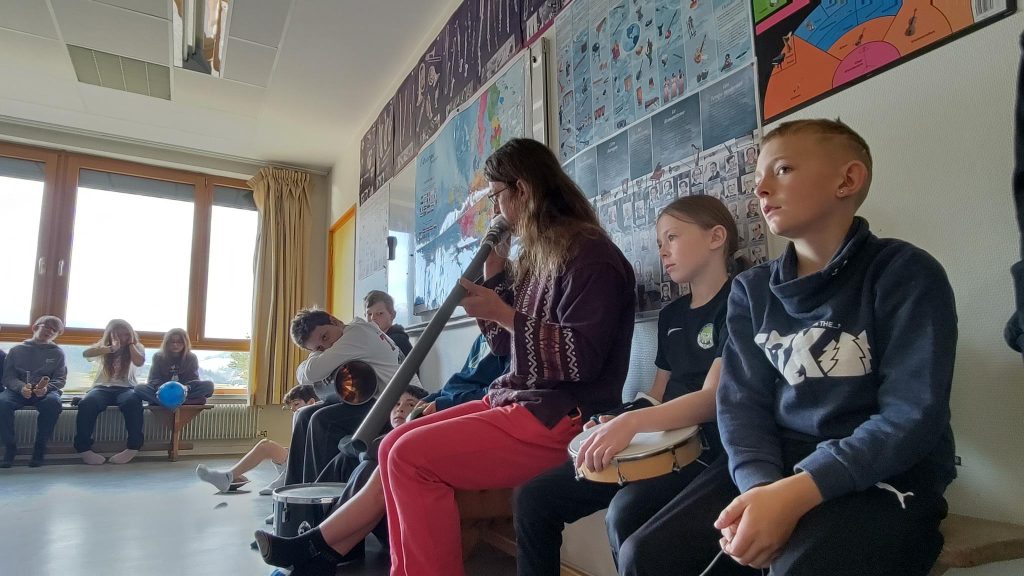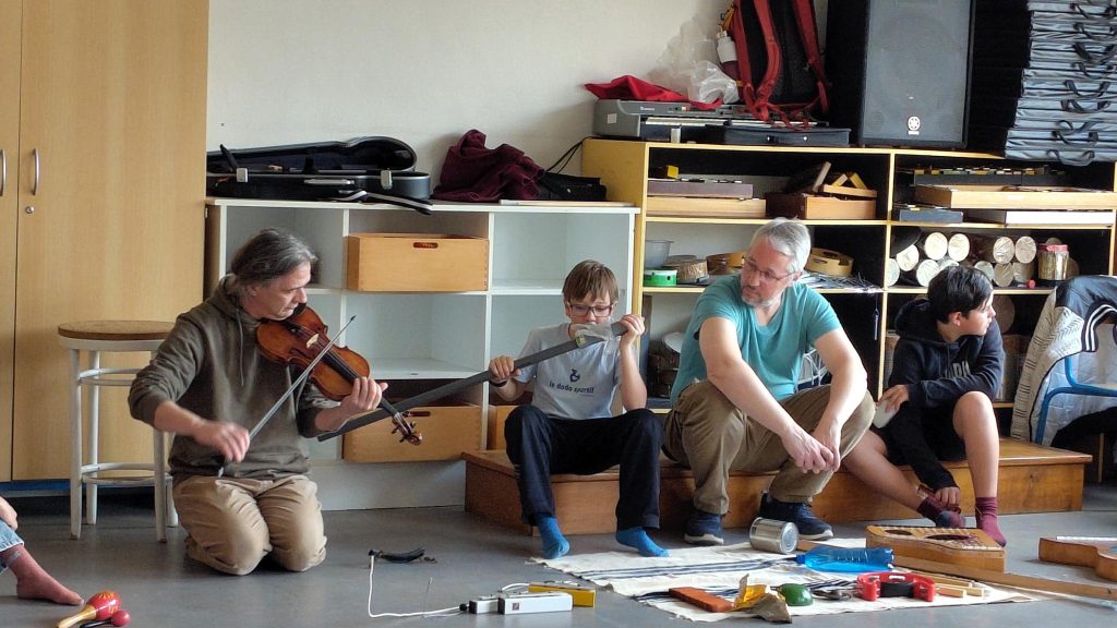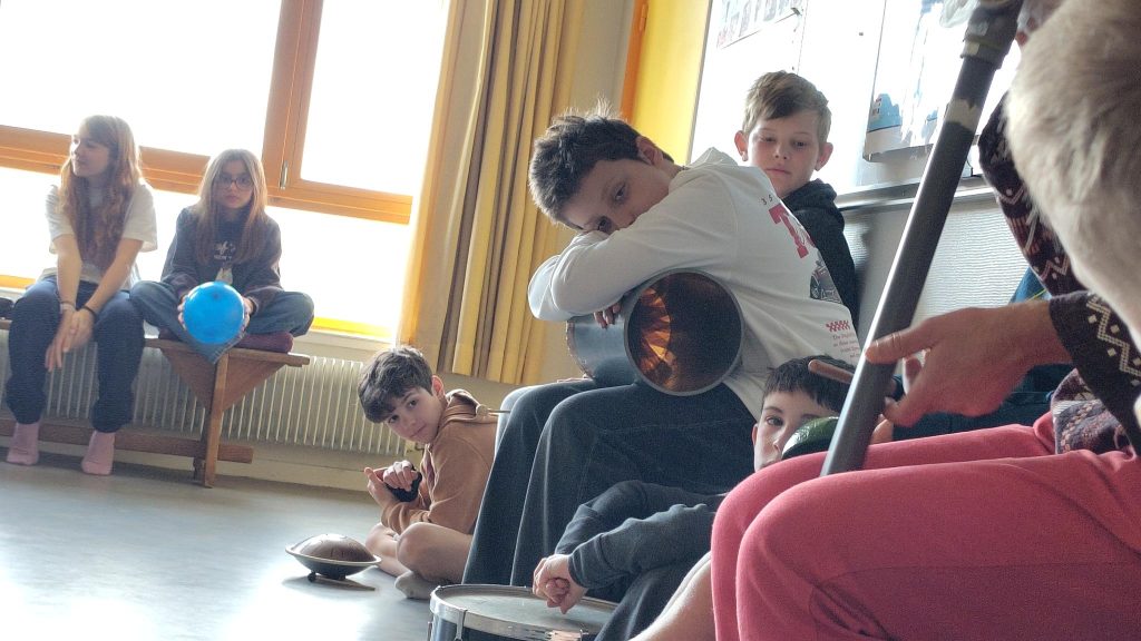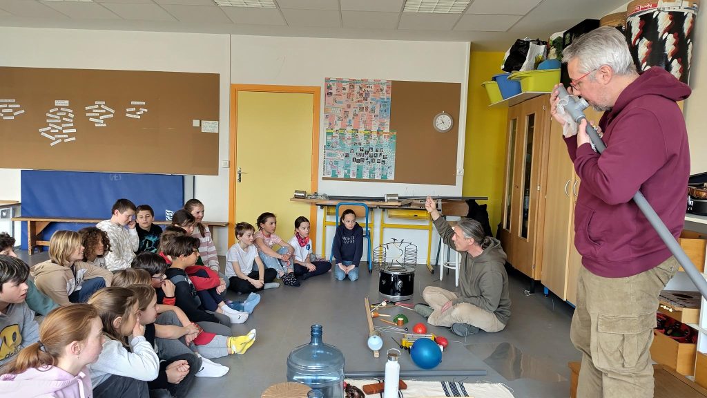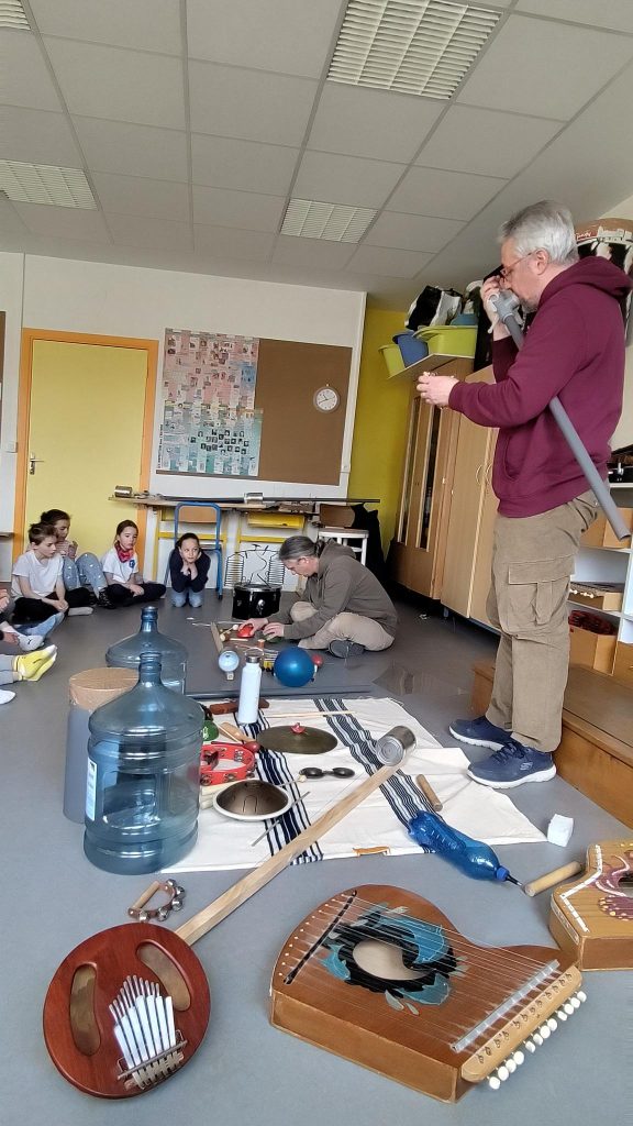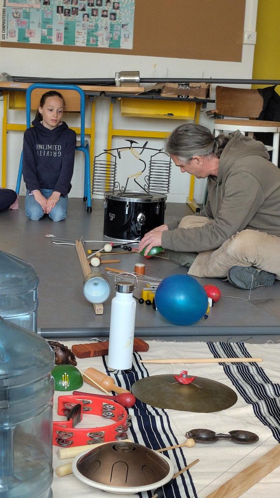 Ils semblent disponibles et cherchent à ouvrir grand les oreilles lorsque Sébastien Egleme (improvisateur) et Mathieu (MI référent de l’école) leur proposent des jeux d’écoute et d’improvisation sonore…